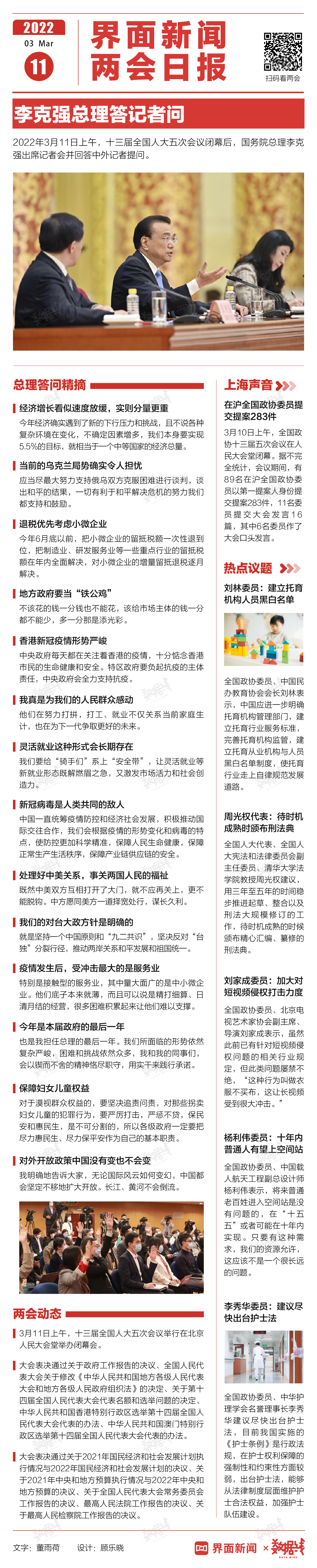 2022年3月11日,国务院总理李克强在北京人民大会堂出席记者会并回答中外记者提问。