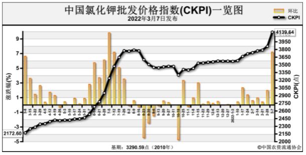 3月10日,中国农资流通网发布数据称,3月7日中国氯化钾批发价格指数为4139.64点,环比上涨7.18%;同比涨幅为90.54%。