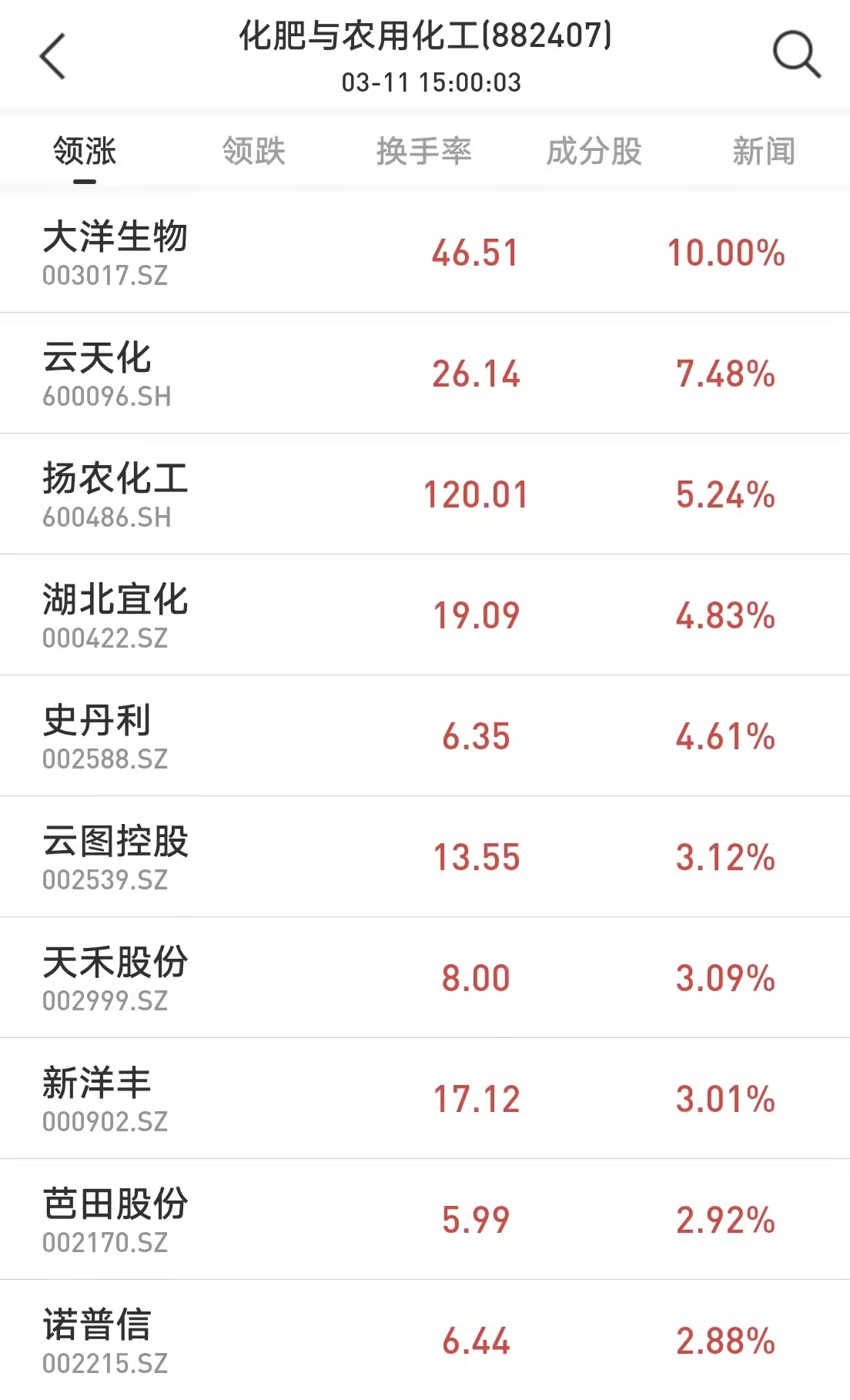 同期,多支股票大涨。其中,大洋生物(003017.SZ)涨停,报收46.51元;云天化(600096.SH)涨7.48%至26.14元;扬农化工(600486.SH)涨5.24%至120.01元。