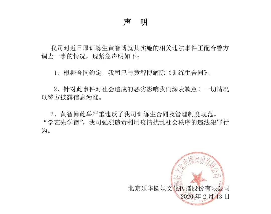 乐华旗下练习生黄智博,曾因参加优酷选秀综艺《以团之名》选秀,开始活跃在大众视野中,但2020年年初,黄智博因涉嫌利用疫情以“卖口罩”为名,实施网络诈骗被捕,乐华随即发表声明与其解约。