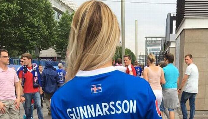 她正与两位女性好友用餐。身着冰岛队球衣的三人看起来就好像一幅活生生的冰岛旅游宣传海报。在欧洲杯参赛国当中,冰岛是领土面积最小的国家,冰岛队刚刚在6月27日的淘汰赛中与英格兰队交锋。