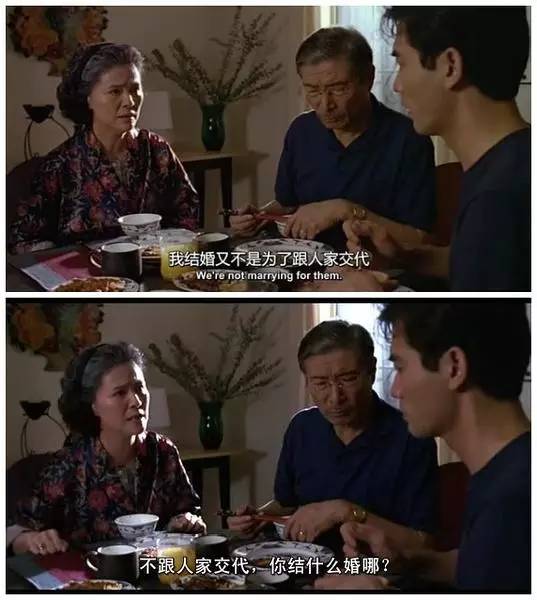 这是《圣经》中上帝对基督徒婚姻的教导,深刻影响着西方社会的婚姻观念。然而对中国人来说,婚姻从来不只是两个人在一起这么简单,“离开父母”更是一种天方夜谭。在电影《喜宴》中,伟同和母亲之间的一番对话或许最能代表这种现代与传统婚姻观念的碰撞:在大多数中国人心中,结婚始终是要“跟人家交待”的。而“跟人家交待”对大多数中国家庭而言,就是向亲戚、邻里、朋友展示自家及亲家的家道、礼数与排场。