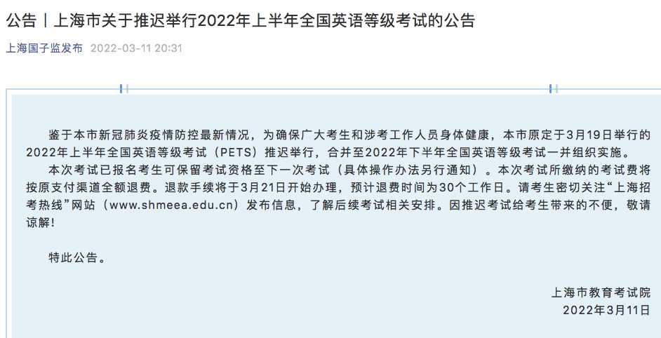 据上海市教育考试院微信公众号“上海国子监发布”,鉴于上海市新冠肺炎疫情防控最新情况,为确保广大考生和涉考工作人员身体健康,上海市原定于3月19日举行的2022年上半年全国英语等级考试(PETS)推迟举行,合并至2022年下半年全国英语等级考试一并组织实施。