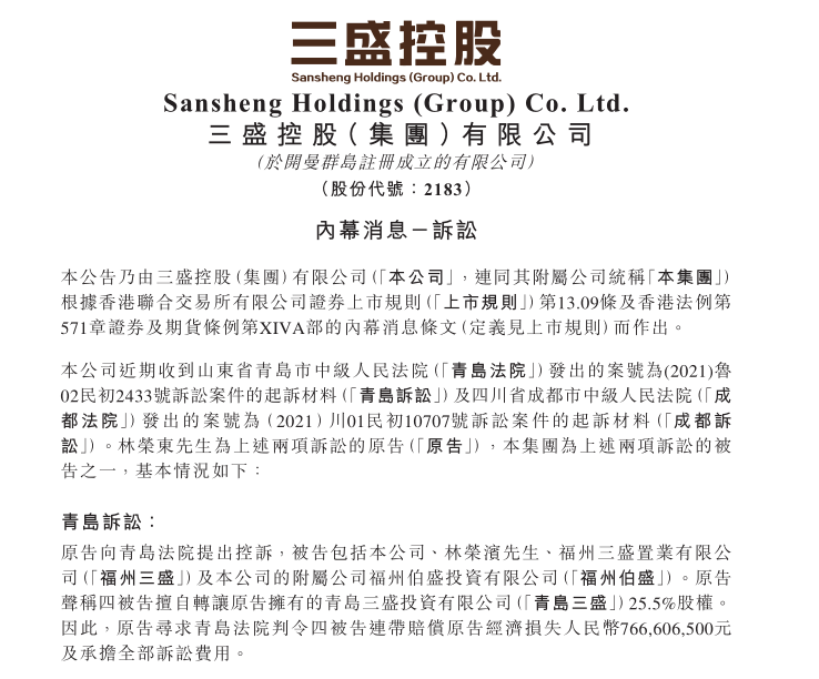3月初,三盛控股(02183. HK)公告,因股权转让纠纷,林荣东已经将三盛控股、林荣滨及相关方告上法庭,两起诉讼合计涉及赔偿金额14.05亿元。