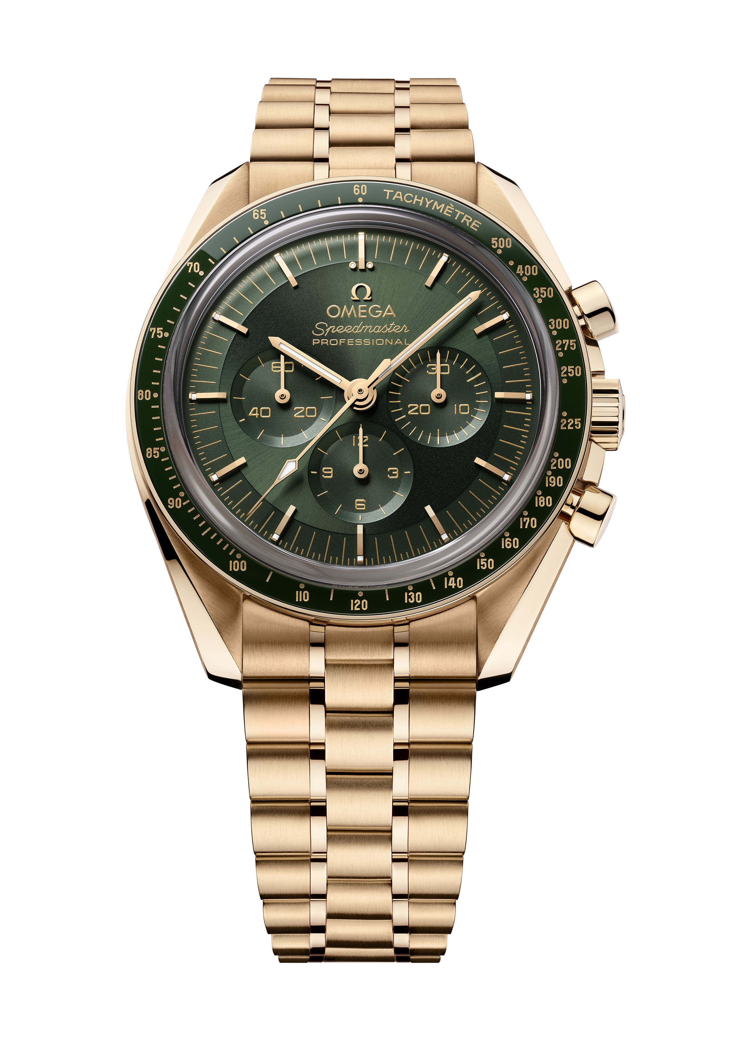 同样采用欧米茄自主研发的贵金属材质的全新腕表还有超霸系列月球表Moonshine 18K金款。Moonshine 18K金是欧米茄研发的贵金属之一,于2019年问世。Moonshine 18K金比传统⻩色18K金的颜色更淡雅,耐腐蚀性也更强。事实上,此前推出的超霸系列月球表采用过精钢、 Sedna 18K金和Canopus 18K金材质,而后两者对标的是传统18K玫瑰金和18K白金。