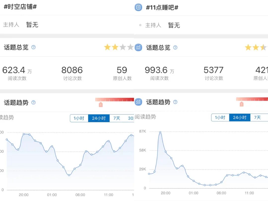 截止发稿前,微博话题#11点睡吧#话题总览量不足1000万,#时空店铺#更只有600万出头;口碑方面,两档节目的豆瓣评分至今未出。