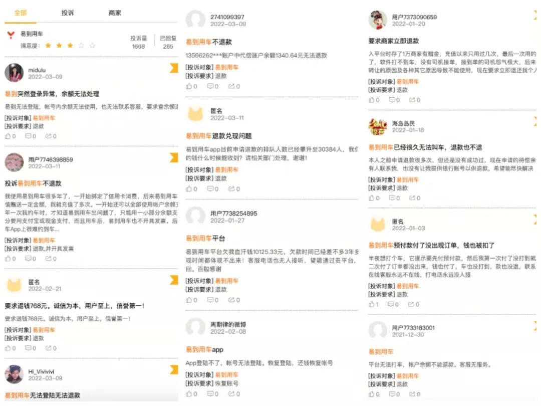 截至3月11日,在黑猫投诉平台,用户对“易到用车”的投诉已达1668条,其中诉求基本都围绕要求“退还账户余额”。这些投诉让易到一度冲上投诉榜单的前几名。