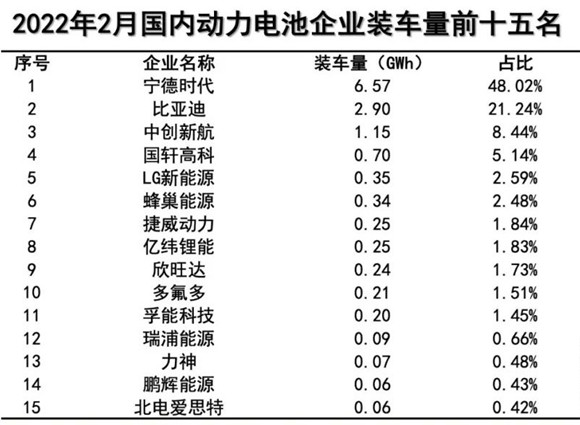 3月11日,中国汽车动力电池产业创新联盟(下称动力电池联盟)发布的月度数据显示,今年2月,国内动力电池装车量排名前三的企业分别为宁德时代(300750.SZ)、比亚迪(002594.SZ)和中创新航。