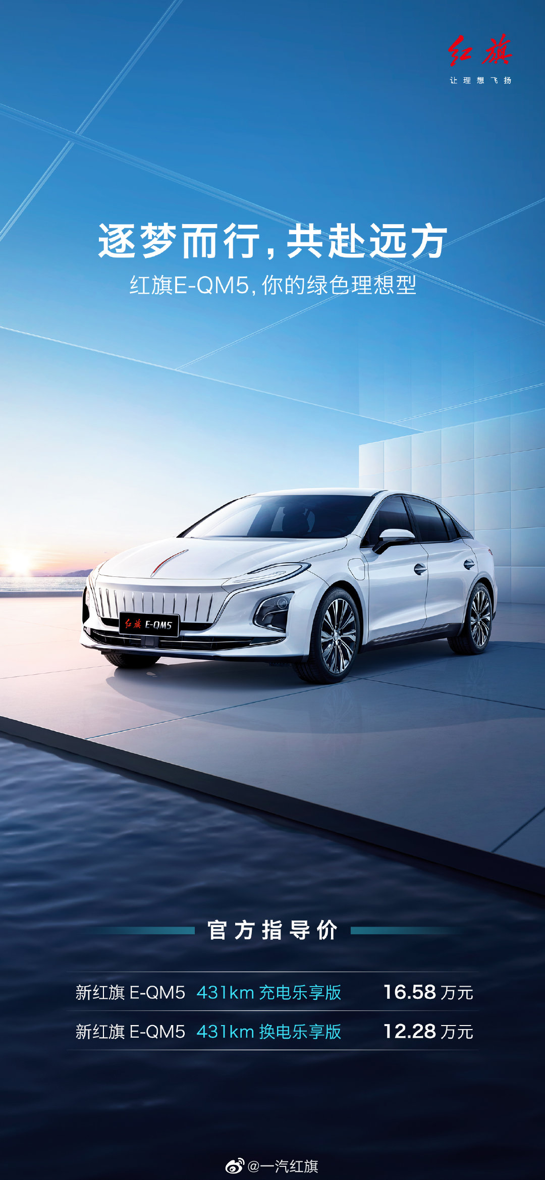 据@一汽红旗 消息,3月12日,红旗首款纯电B级轿车红旗E-QM5正式上市,共两款车型,官方指导价12.28万元-16.58万元。