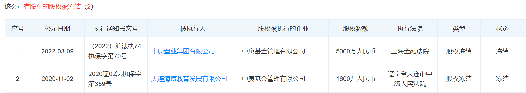 原股东大海海博教育发展有限公司持有的中庚基金股权被辽宁省大连市中级人民法院执行冻结,被冻结的股权金额为1600万人民币,冻结期限从2020年11月2日至2023年11月1日。