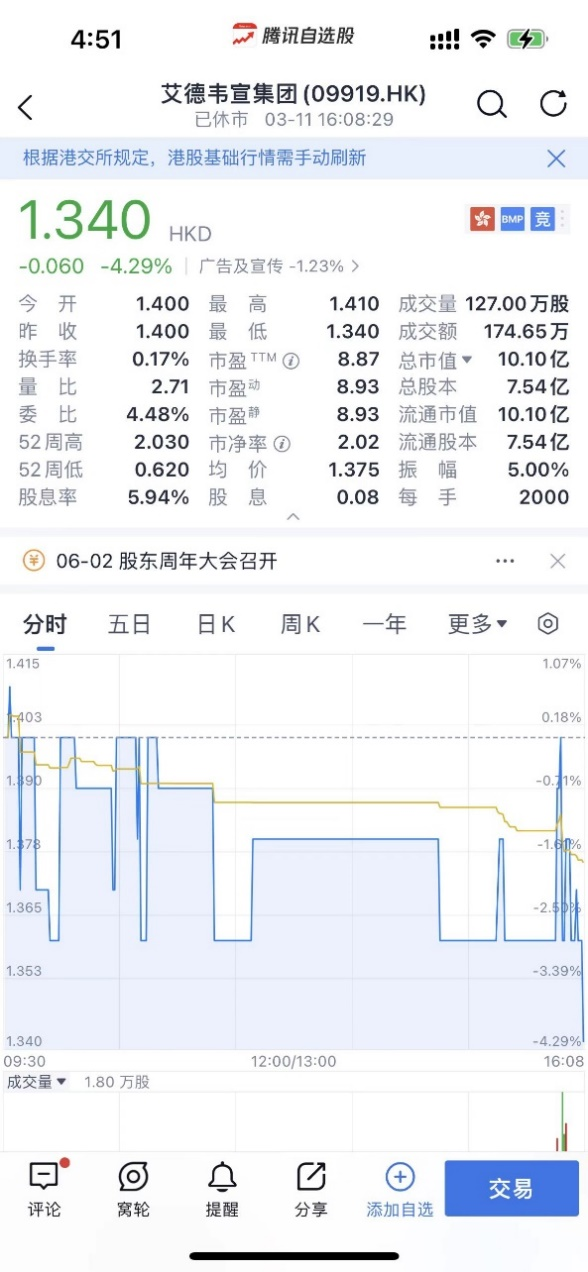 我们先来看下艾德韦宣公司的股票情况,按照2022年2月11日的情况来看,一天的成交额是174.65万,这么“大”的交易额就导致日交易先就跟快断气的人的心电图差不多。如果按照其所公布的约人民币102.6百万元的年净利润来说,这一年赚的钱都不足以覆盖一天的回购。