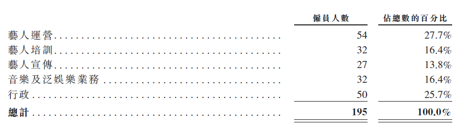 乐华的现金储备较为充足。截至2022年1月,公司现金及现金等价物为5.3亿元。但在2022年3月分红4亿元后(2020年也曾分红2亿元),乐华现金及现金等价物约为1.3亿元,流动资产净值约为1.86亿元。截至2021年12月31日,乐华拥有58名签约艺人,包括韩庚、王一博、孟美岐、吴宣仪、范丞丞等知名艺人,并且建立了包括80名训练生在内的人才储备体系,以及包括艺人运营(包括20名商务经纪和19名执行经纪)、艺人培训、艺人宣传在内的共计195名员工(下图)。
