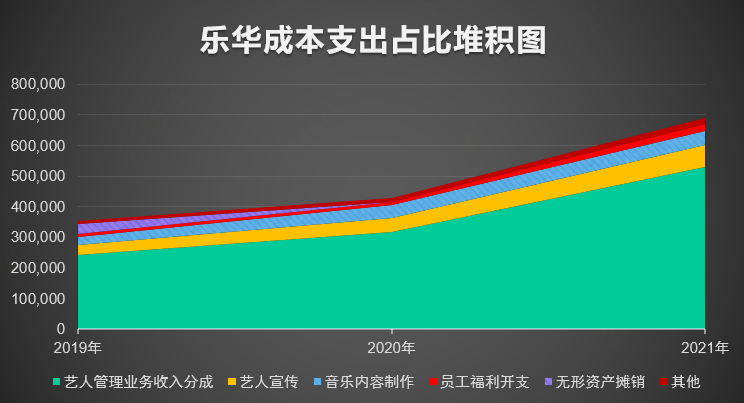 艺人经纪公司通过艺人获得收入,并给予艺人分成。2019年到2021年,整体来看,乐华给予艺人的总分成在艺人带来的总收入中,分别占比45.4%、39.4%和45%。我们可以粗略认为,乐华和艺人的收入分配比为55:45。