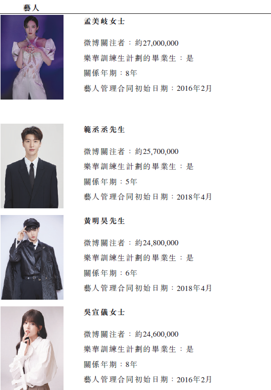 值得注意的是,2010年5月签约乐华的韩庚,合约正常应于2021年5月到期,但招股书并未披露乐华与韩庚的续约信息。而除了韩庚和王一博,其他乐华目前的头部艺人,孟美岐、范丞丞、黄明昊、吴宣仪等的合约都将于2024年先后到期。