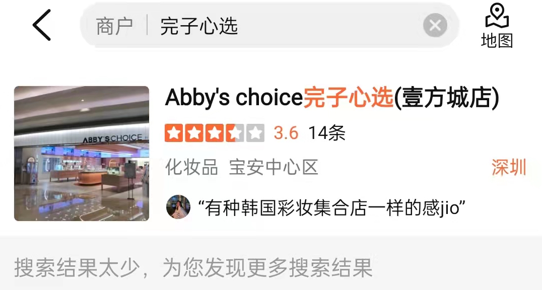 逸仙电商另一进入线下的品牌Abby’s choice完子心选只短暂地游历了一次线下就戛然而止,目前在大众点评上,显示仅有深圳壹方城一家门店。小奥汀在上海TX淮海孤军奋战,再无拓店消息。