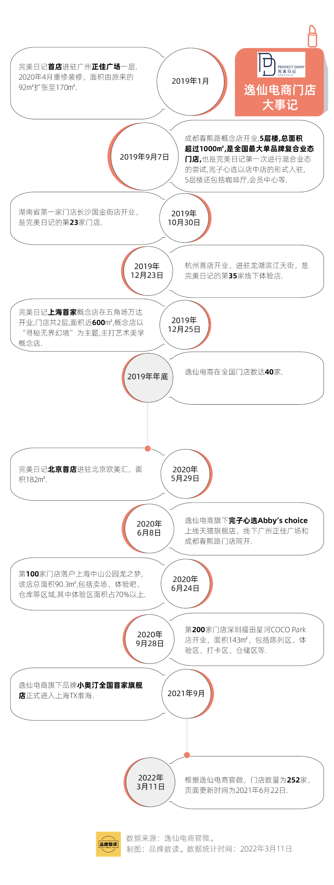 拉长时间线来看,完美日记在线下的打法也颇为激进。根据逸仙电商官方消息,在2020年6月至2020年9月三个月左右的时间里,完美日记从100家店开到200家,而完成第一个百家店的目标,完美日记用了整整一年半的时间。逸仙电商2019年官方的开店计划是,未来3年,2020年开店数量达到200+、2021年达到400+、2022年达到600+。