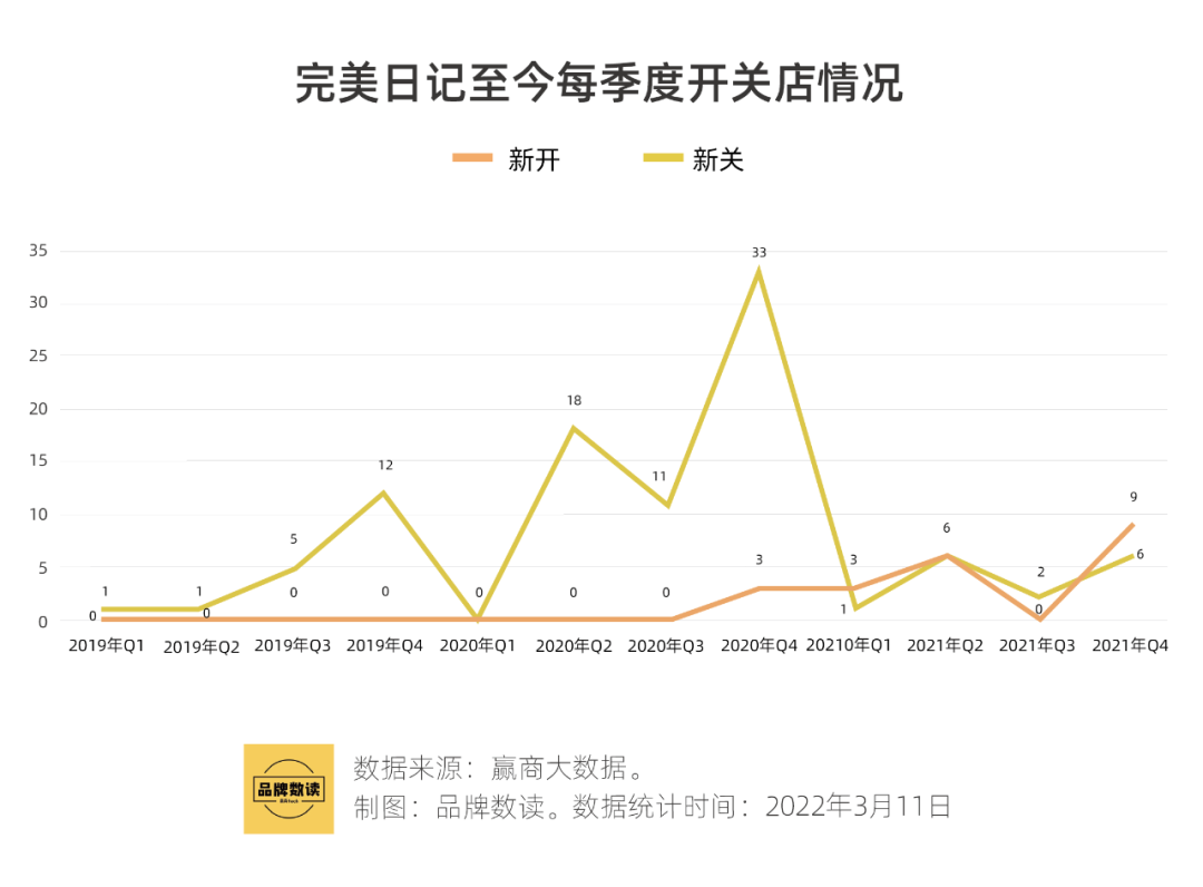 完美日记线下渠道的转折点在2020年末,赢商大数据显示,2020年第四季度完美日记线下首次出现了关店,官方关于门店的动态相比于2019年少了很多。在全国24城5万方以上的购物中心中,2021年完美日记开店15家,关店18家,也就是说,2021年完美日记的门店处于负增长的状态。