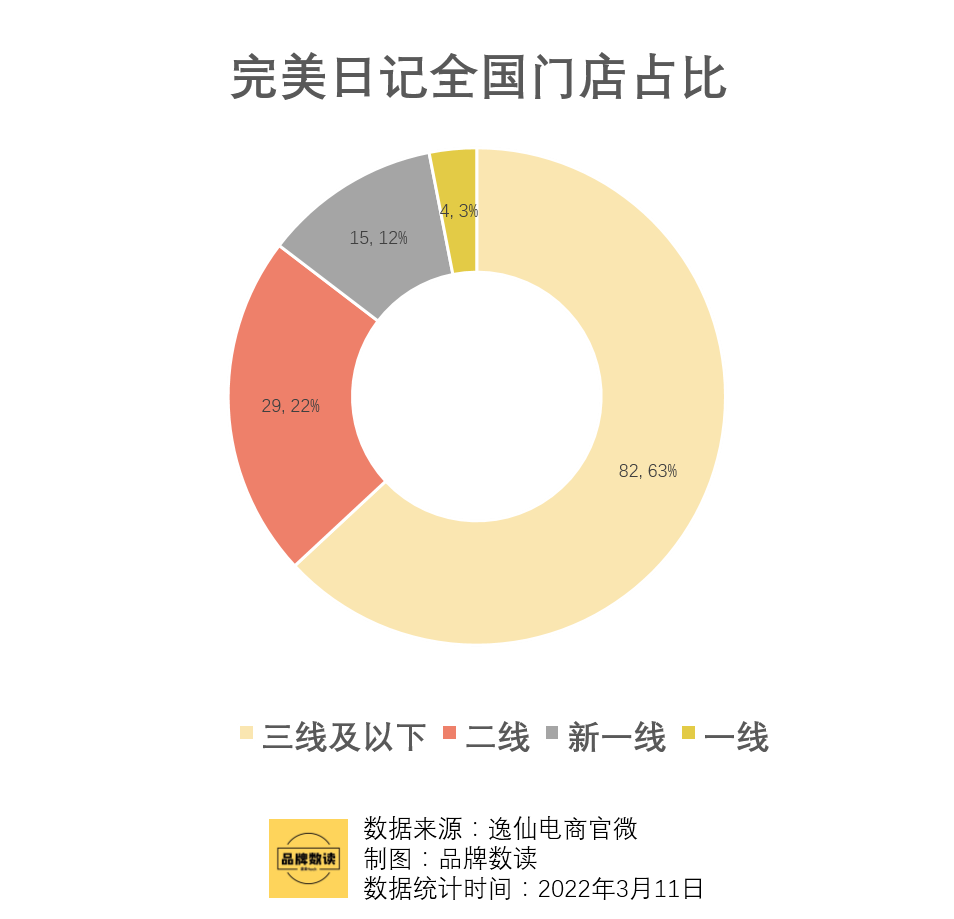 门店数据也得到了官网的印证。现阶段,完美日记共有多少家252家门店,一线新一线城市门店数量占比为15%,二线城市占比22%,三线及下沉市场占比63%。尚未达到2021年的400家店目标。