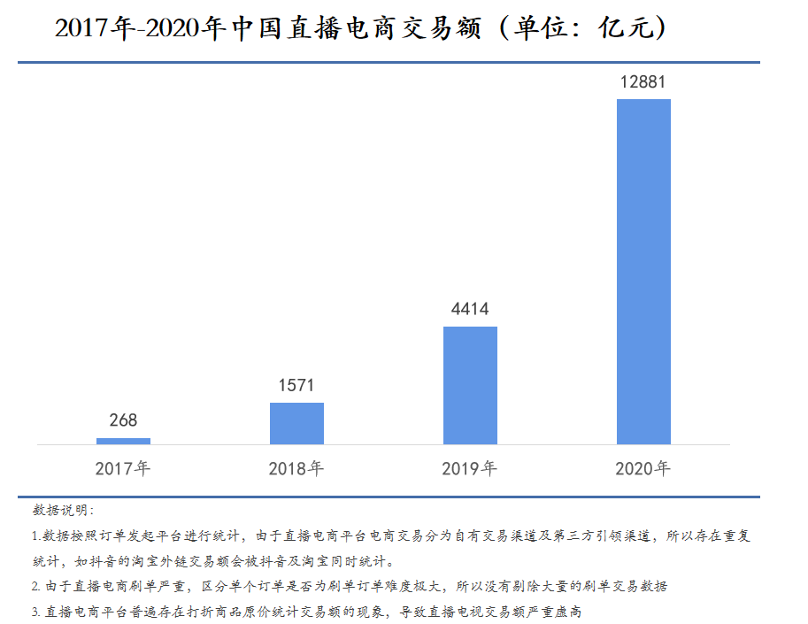 一场直播动辄过亿的交易额,上百万的订单,不断在刷新着我们的认知。而据《【Fast data极数】2021中国直播电商行业报告》发布的数据显示,国内直播电商用户渗透率已从2019年的7.8%增长到2020年的17.8%。同期直播电商销售额也从2017年的268亿元增长到2020年的12881亿元。