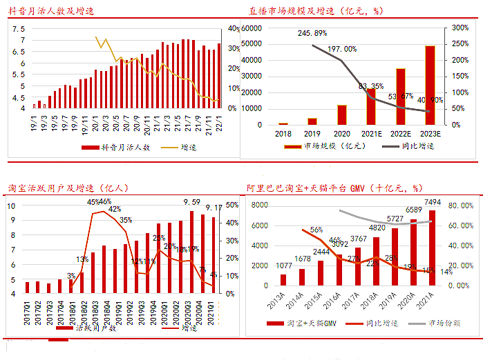 综合易观千帆以及华西证券发布的数据来看,抖音月活自2020年下半年突破6亿大关后趋于稳定,2021年全年月活在6.5-7亿人次间波动,下半年同比增速放缓至个位数增长。此外,抖音在国内直播市场上增速也在放缓,预计到2023年其在直播市场的增速仅有40.80%。