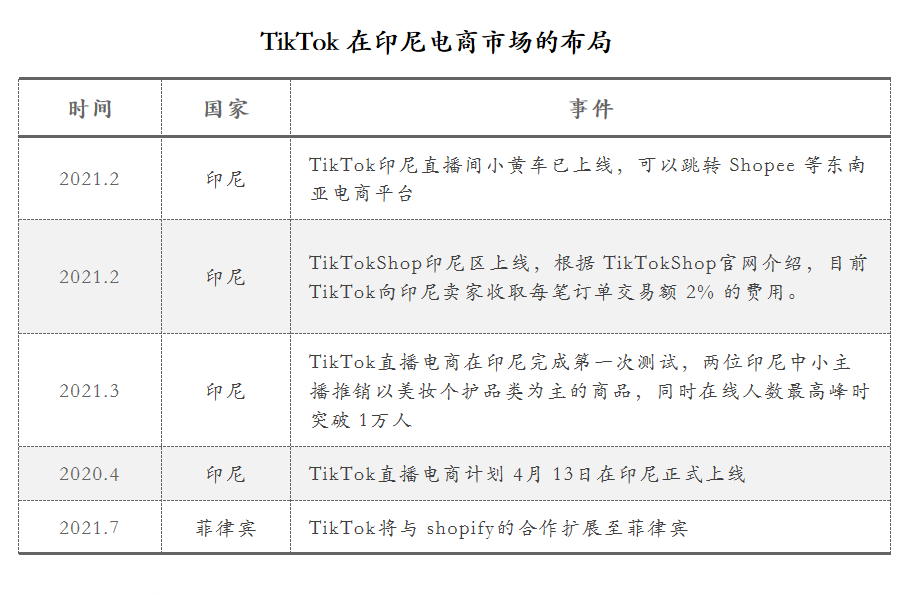 在东南亚市场,Tik Tok在去年2月份时,在印尼直播间中加入小黄车功能。通过小黄车可以引流至Shopee等电商平台,又在3月上线Tik Tok Shop。与此同时,Tik Tok直播电商还在印尼完成第一次测试,两位印尼主播推销以美妆个护类为主的商品,购物和支付全程都在平台内完成。