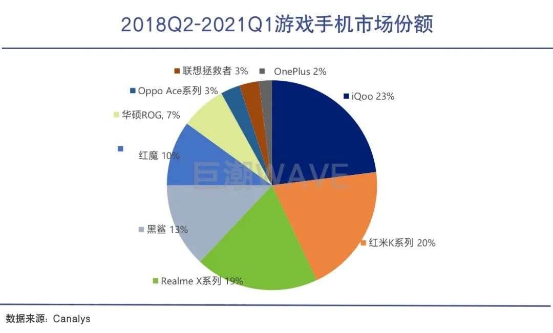 从机构Canalys发布的2018年第二季度至2021年第一季度期间各大游戏手机品牌的市场份额榜单可以看出,市场份额位居前列的iQOO、Redmi、realme、OPPO和一加严格意义上说并不属于游戏手机范畴。而行业默认的游戏手机代表品牌黑鲨、红魔、华硕ROG、联想拯救者市占率排名都相对靠后。