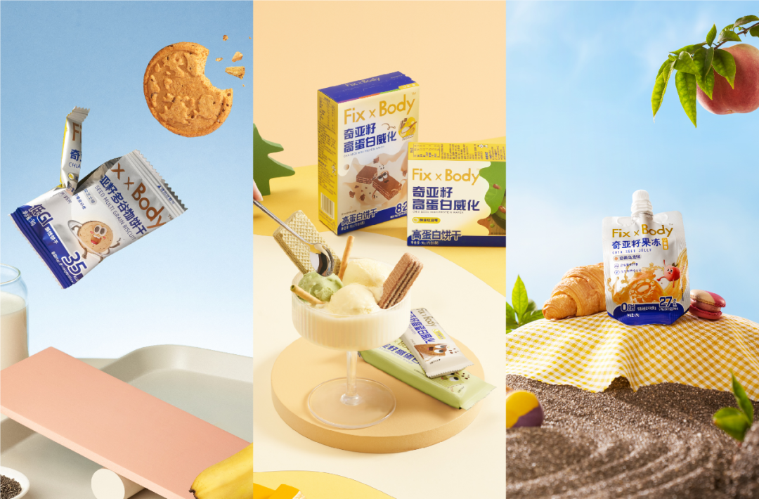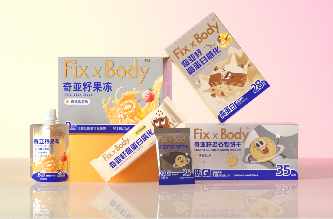 旺旺集团针对消费者新需求创造了新锐健康食品全类目品牌「FixXBody」。区别于传统健康食品品牌核心与视觉表达的:健康就要自律、禁欲和简洁的表达,「FixXBody」结合旺旺集团母体趣味的概念,重新定义「趣味+专业」的视觉体系。既有食品的食欲感「趣味的部分」,也保证了健康食品:卡路里标识的表达「专业」。针对不同的四个系列,让四个系列做到同而不同——既有统一的品牌感,也传达出单品的价值,并且保留了产品的系列感,让消费者可以识别不同系列,不同产品的特点,同时也加深了「FixXBody」品牌的视觉记忆。