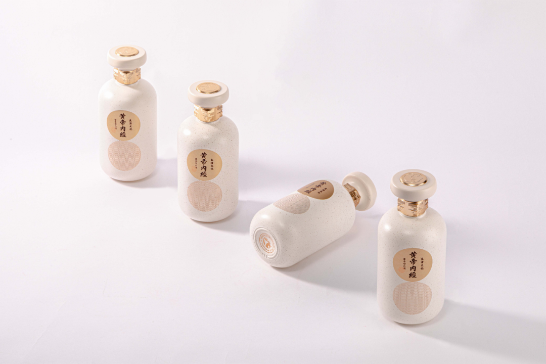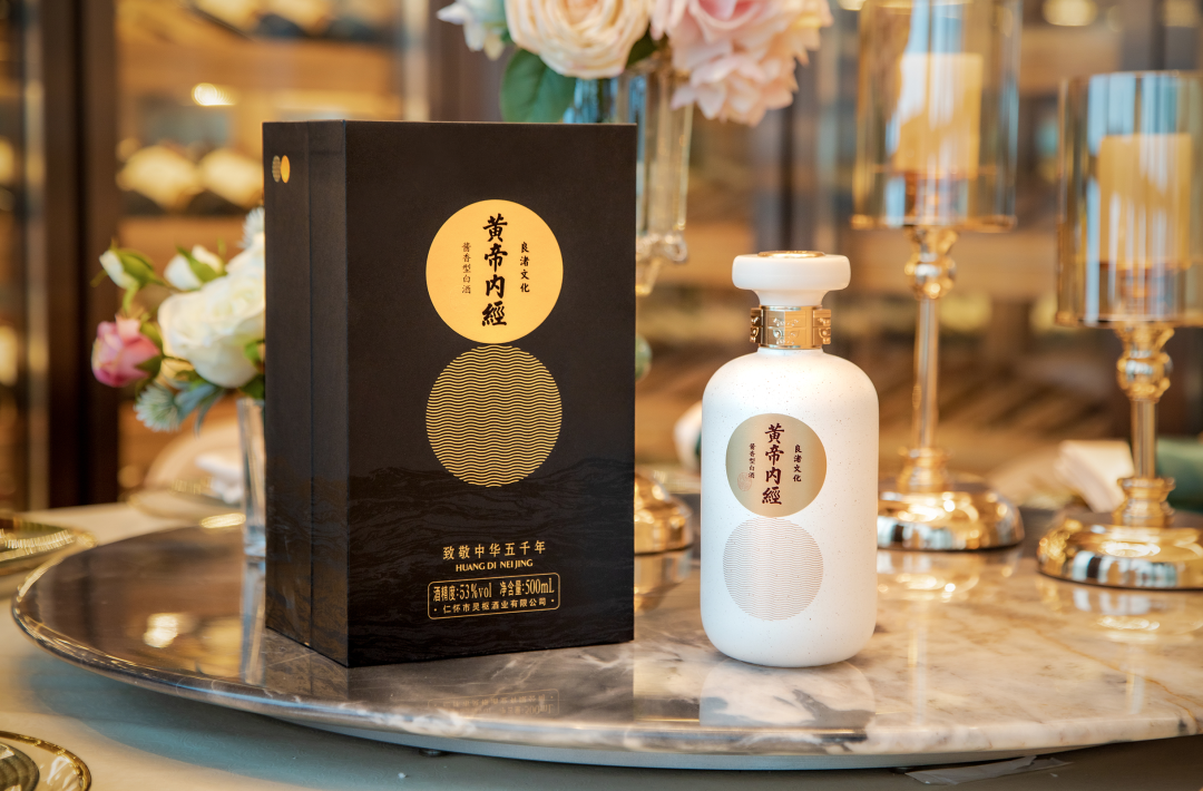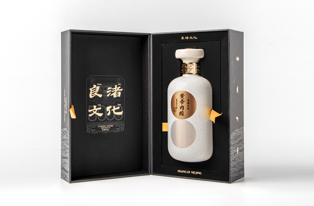 良渚遗址是中华文明史五千年当之无愧的见证,黄帝内经跨越时空,用行动守护良渚文化,打造黄帝内经良渚酒,让中华五千多年文化与人们日常生活紧密相连。瓶身上使用中国传统陶瓷特殊釉色,具有收藏价值。烫金印章是尊贵象征,实心印章,实为阳,如太阳冉冉升起,意象万千,寓意大国崛起;水波纹印章,虚为阴,如水流绵延不绝,致敬良渚文化源远流长。镀金良渚“玉琮”瓶盖,细腻精美。采用仿玉工艺盖帽,展示良渚“玉璧”造型。最后装入运用了进口烫印金箔纸、水晶丝印暗纹、立体击凸等工艺的礼盒,凸显极致尊贵。