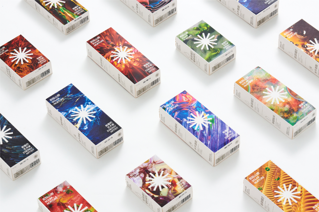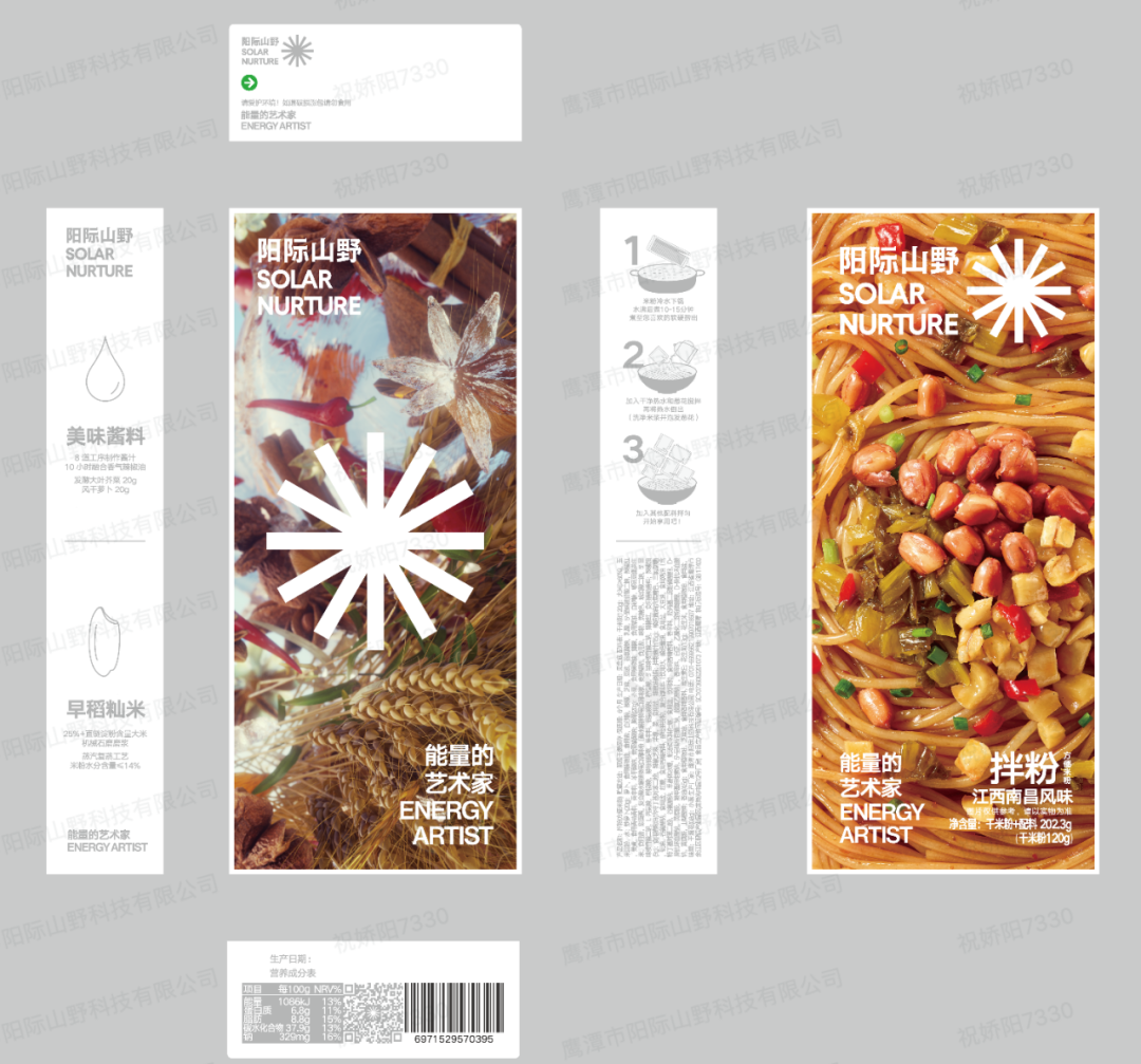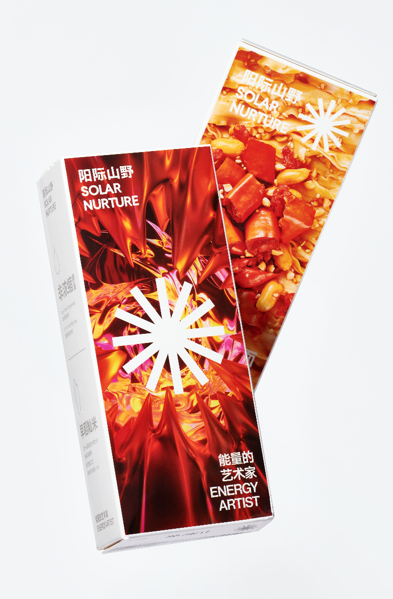 阳际山野以将传统用新的形式呈现给新一代人作为目标, “阳际山野”这个名称描述着太阳能量传递到地球食物链的第一个步骤。人类是“能量的艺术家”。阳际山野=太阳光芒(中国古典太阳纹)+山野大地(新大地艺术),太阳象征希望与生命力。因此品牌重塑聚焦到“能量艺术家”,并以太阳作为识别符号,12条线段意为时间刻度。太阳不仅是地球的能量供给者,也使得人类有了时间的概念。古人讲“日出而作,日落而息”,人类的生活是围绕太阳与时间展开的,而好的美食往往经过几代人长久的沉淀才得以保留,所以打破传统包装正反面的认知,以双面包装,采用实物图+渲染图,直观的传达给消费者食物本身的形态,所见即所得。渲染图的部分,融合品牌理念,赋予每个口味,独特的食品艺术。