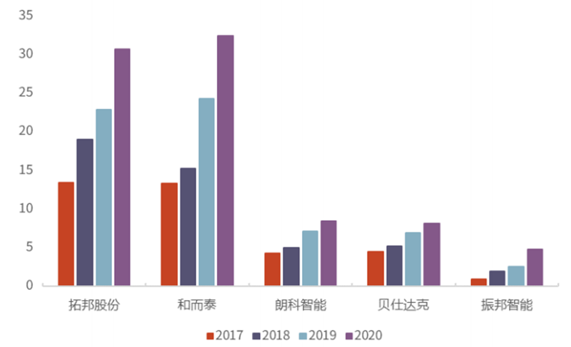 2018 年以来,位列第一阵营的拓邦股份、和而泰相对占有率(占图表 41 内 8家上市公司收入总和比例)不断提升,2020 年两家厂商相对占有率已达 57.47%,拓邦股份、和而泰的体量和其他 6 家厂商相比已存在明显优势。国内智能控制器行业的规模效应释放越来越明显,上游芯片紧缺背景下龙头企业成本优势、产能优势、技术优势等与其他公司的差距将逐步拉开。