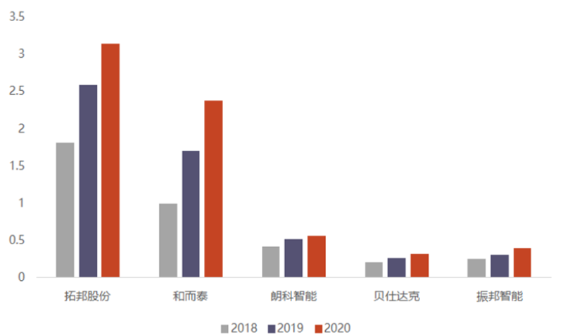 作为头部厂商,拓邦股份、和而泰不仅营收比其他公司更高,研发投入比例也高于同业公司。随着消费者需求的不断升级,智能控制器的技术含量也越来越高,研发水平将会成为智能控制器行业的关键成功因素,头部厂商高额的营收足以支撑其加大研发投入,进一步拉开同其他厂商的技术差距,从而打入更多优质客户供应链,获得更多市场份额。相比之下,众多未上市的小企业由于资金量难以支撑研发需要,产品性能难以满足下游客户需求,将会逐步丧失市场订单,最终被高速发展迭代的市场淘汰。