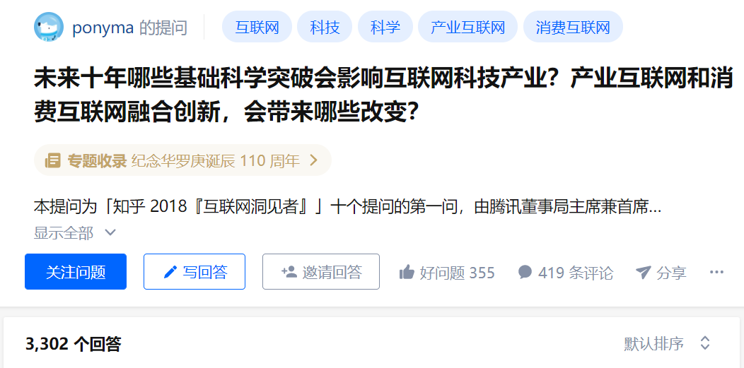 而随着移动互联网时代的高速发展,智能手机市场红利的天花板触顶,手游市场同样开始饱和后,2018年马化腾又于知乎发问“未来十年哪些基础科学突破会影响互联网科技产业?产业互联网和消费互联网融合创新,会带来哪些改变?”。目前该问题下已经有了超3300个回答,但并没有人能肯定与绝对地进行预测。