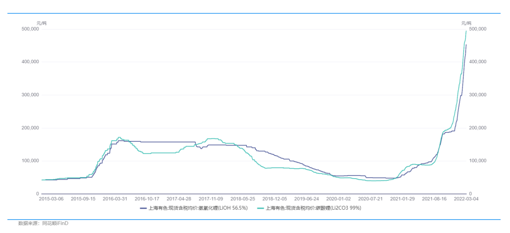 根据上海有色数据显示,3月7日,碳酸锂价格上涨至49.7万/吨,氢氧化锂价格上升至45.95万/吨,而二者的2021年初价格还不足10万/吨,仅一年时间,涨幅接近4倍。