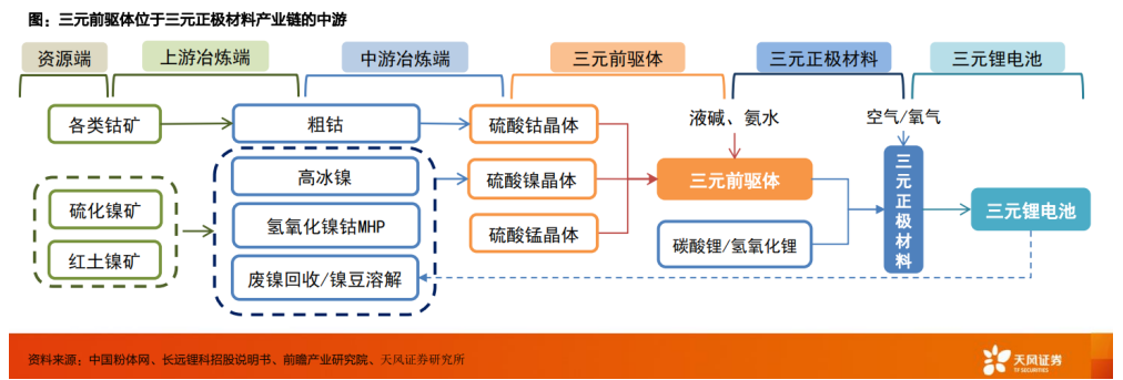 从三元锂电池的产业链上来看,上游为钴镍等矿产资源,中游为三元前驱体和三元正极材料,下游为三元锂电池。
