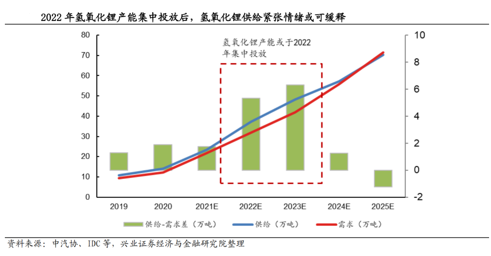 根据各厂商产能扩张计划可以看出2022和2023年为产能集中释放年份。以新能源车的渗透率为基数,测算2024、2025年氢氧化锂需求增量显著大于供给增量,且2025年氢氧化锂冶炼产能将会出现明显缺口。