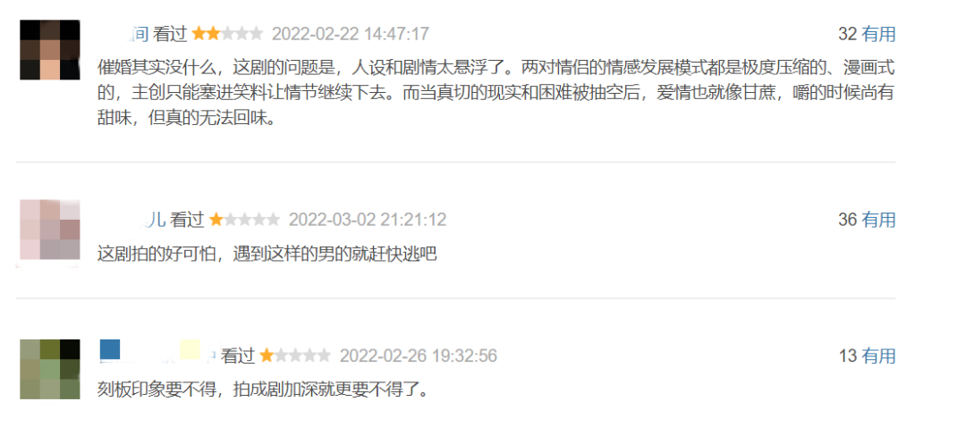 尽管《我们的婚姻》和《婚姻的两种猜想》热度较高,但两剧的口碑表现并不理想,两剧播出都已超半月,豆瓣皆未开分,但一星与二星差评已经排满《婚姻的两种猜想》的豆瓣短平区。以目前口碑表现来看,《我们的婚姻》豆瓣评分基本能上及格线,但《婚姻的两种猜想》肯定难上6分。