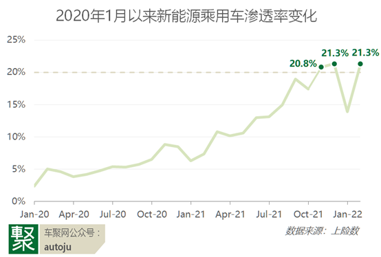 上险数显示,2022年2月国内新能源车销售24.62万辆,环比下滑21.7%,同比高增159.2%,渗透率:21.3%,较1月提升7.4个百分点。同时,这是月度第三次突破20%,前两次分别是2021年11月的20.8%和12月的21.3%。