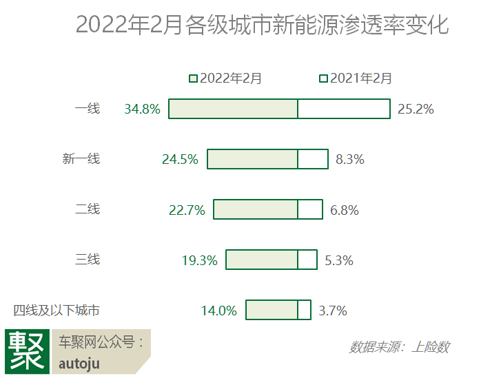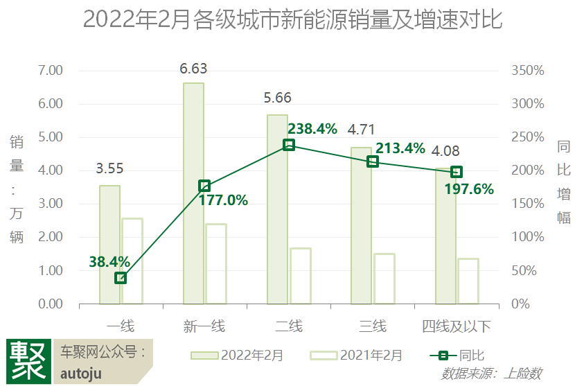 新能源车需求重心出现转移,由一线城市转向二三四线城市。数据显示,2022年2月,一线城市新能源车销售3.55万辆,同比增长38.4%,在各级城市群中均处最低水平。与之相比,其他线城市群均高幅增长,增速远高于市场平均水平,其中二线、三线增速更是在200%以上。