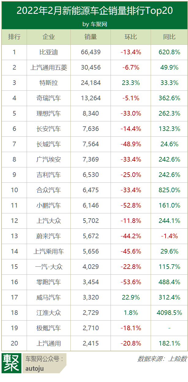 榜首仍是比亚迪,2月新能源同比销售66,439辆,同比猛增620.8%,这一成绩令众多车企眼馋。销量是第二位五菱的2倍多,是第三位特斯拉的近3倍。