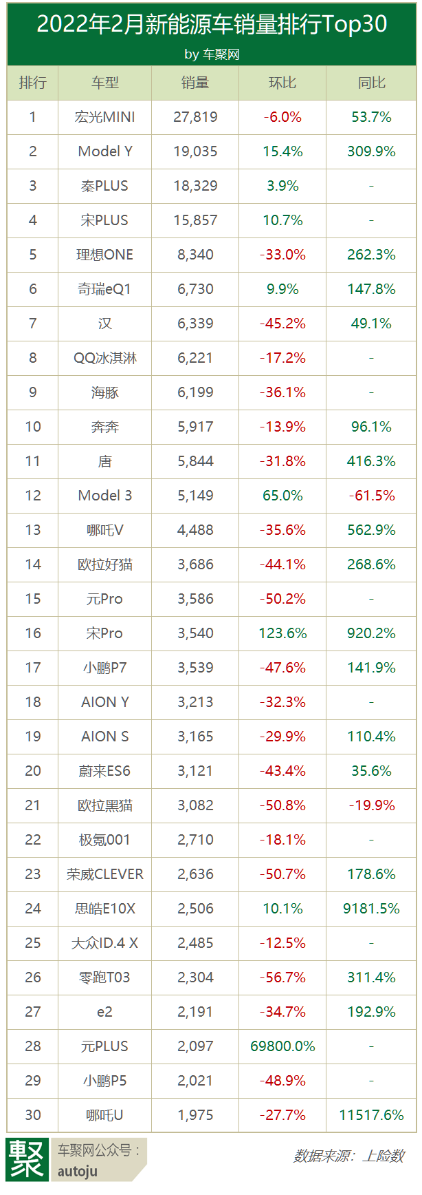第三的特斯拉2月在华销售24,184辆,环比增长23.3%,是榜中少数环比增长的企业,同比则增长33.3%,增幅放缓且远低于市场整体水平。Model Y销量19,035辆,位居车型榜第二;Mode 3为5,149辆,排名第十二位。