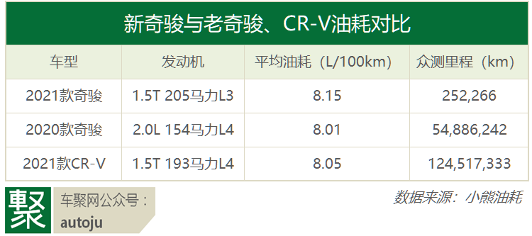 我们再来看一眼小熊油耗的奇骏油耗报告,虽然样本数还不够多。但很明显,新奇骏相比同级别的老奇骏和本田CR-V,在油耗上并没有优势,甚至还要比后两者都高一些。而它的工信部标准油耗却做到了5.8L/100km,比CR-V低了足足0.8L/100km,这一来一去,就有了近1L的差距。