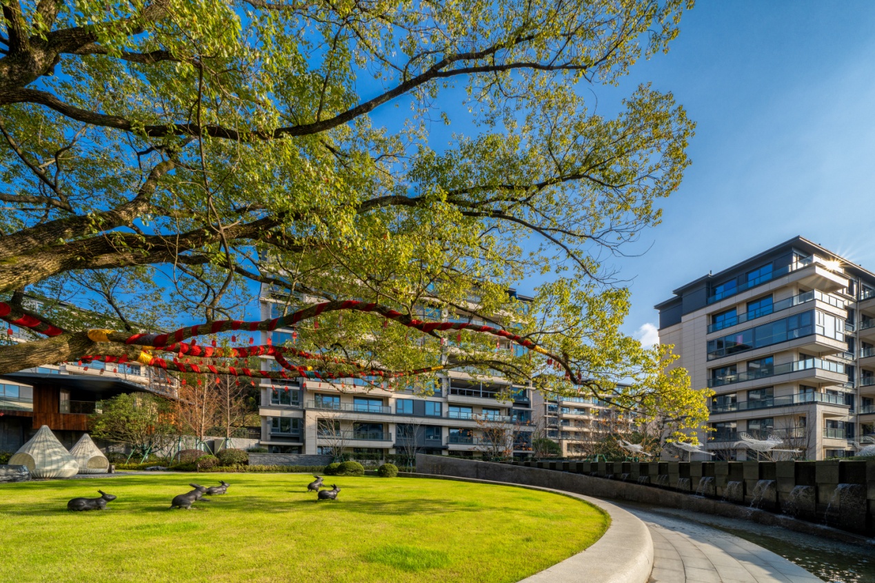 在南京项目——滨江龙湖·翡翠上城的土地踏勘之初,龙湖设计师发现这里有一棵原生全冠双头香樟树,于是团队一致决定为它专设一方土地。