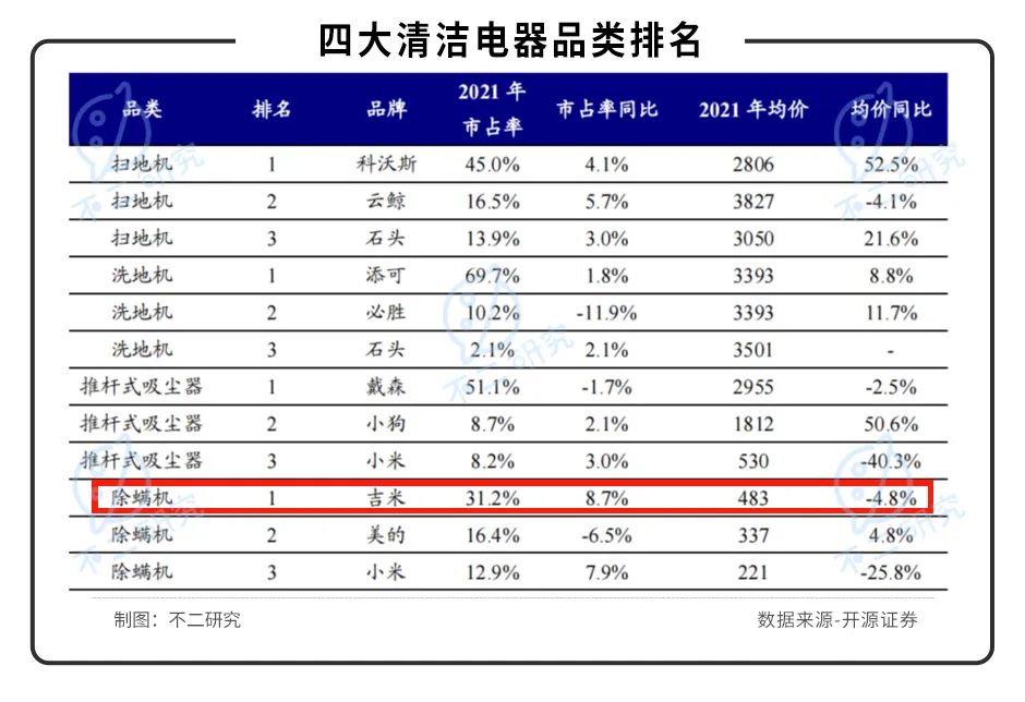 但是,「不二研究」认为,莱克电气布局的清洁电器和小家电行业目前竞争十分激烈,很多品类头部效应明显。据奥维云网数据显示,清洁电器四大品类中,莱克电气仅除螨仪处于行业头部。因此,这样的高增速并不一定可以持续。
