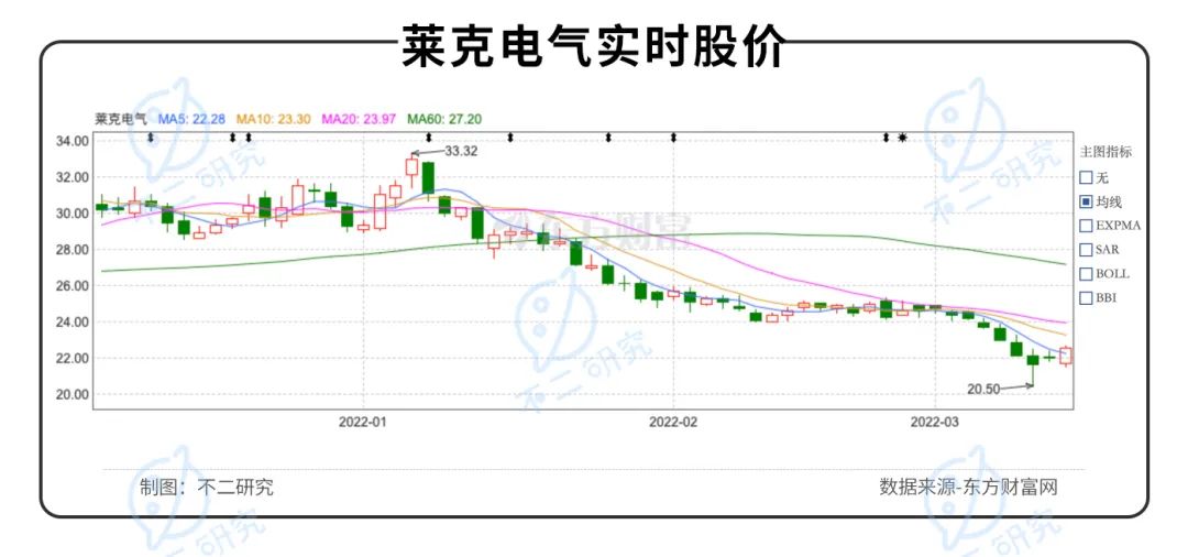 截至3月11日,莱克电气报收22.56元/股,对应市值129.65亿元;其股价高点位于2021年7月1日的62.76元/股,莱克电气于去年进行中期分红,每10股转4股派20元,复权后计算其股价较高点下滑47.86%。