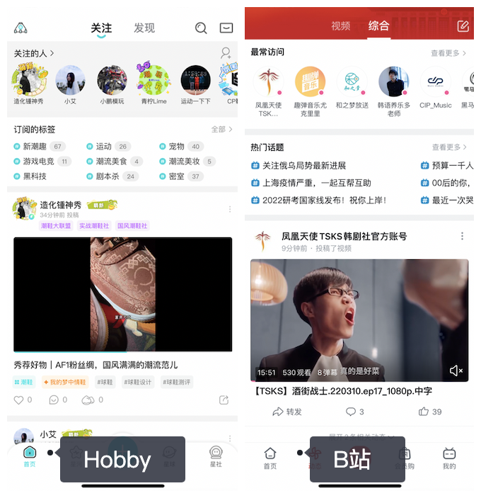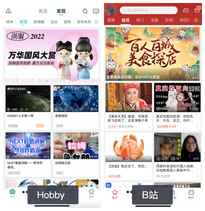 首先,在页面布局上,进入Hobby「首页」,切换「发现」和「关注」两个tab,会看到和B站「首页」-「推荐」及「动态」极为相似的两个页面。