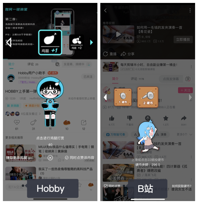 另外,对比B站对视频的「投币」功能,和Hobby上的「鸡腿打赏」,可以看到两个页面几乎一样,打赏数量都可切换+1或+2,并能在打赏同时对内容进行点赞。