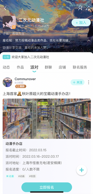 星社和商业化及线下活动进行了连接,可关联店铺为商家引流、和合作品牌进行联名。用户发布的「派对」信息,也可选择和星社关联,在星社内展示。
