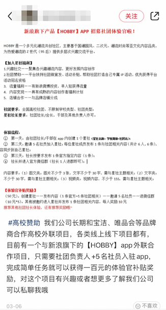 从一份Hobby社团体验官招募通知来看,近期Hobby正投入大量资源,在高校学生渠道扩充社团数量。学生创建星社,并招募5名社员,完成发文等任务后,即可获得100元补贴奖励。