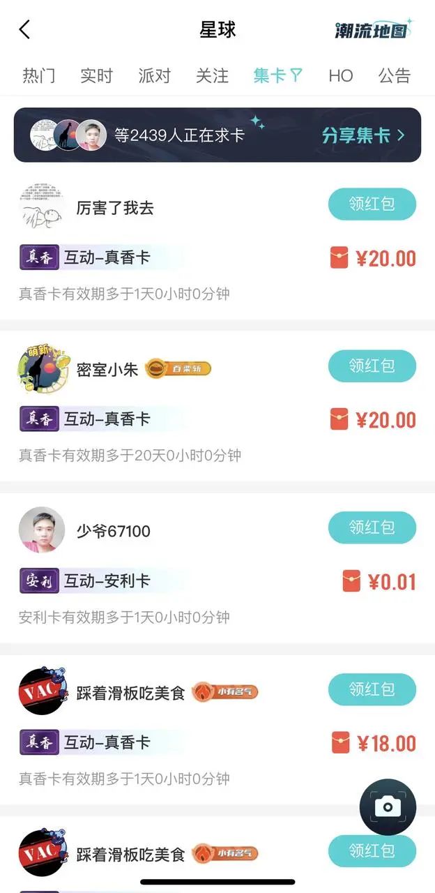 用户完成互动或创作任务,可获得「星卡」,也可发「悬赏红包」求卡。参加潮流派对,有机会获得星卡中最稀有的「真香卡」,可在Hobby内交换现金或用来兑换实物商品。