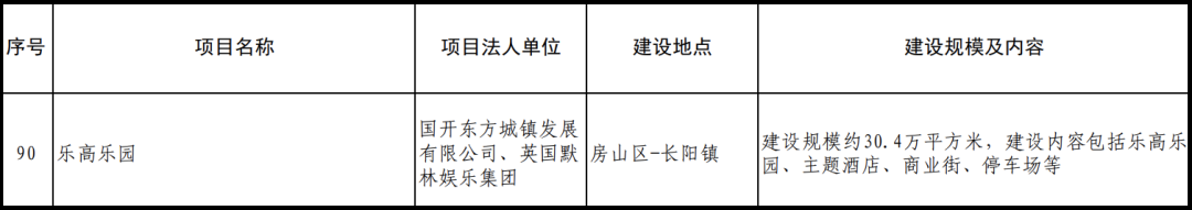 近期,在北京市发改委网站发布的“北京市2022年重点工程计划的通知”中,乐高乐园被列为“文化旅游产业”新建项目,选址也从之前的房山区青龙湖镇改为房山区长阳镇,建设规模约30.4万平方米,包括乐高乐园、主题酒店、商业街、停车场等。